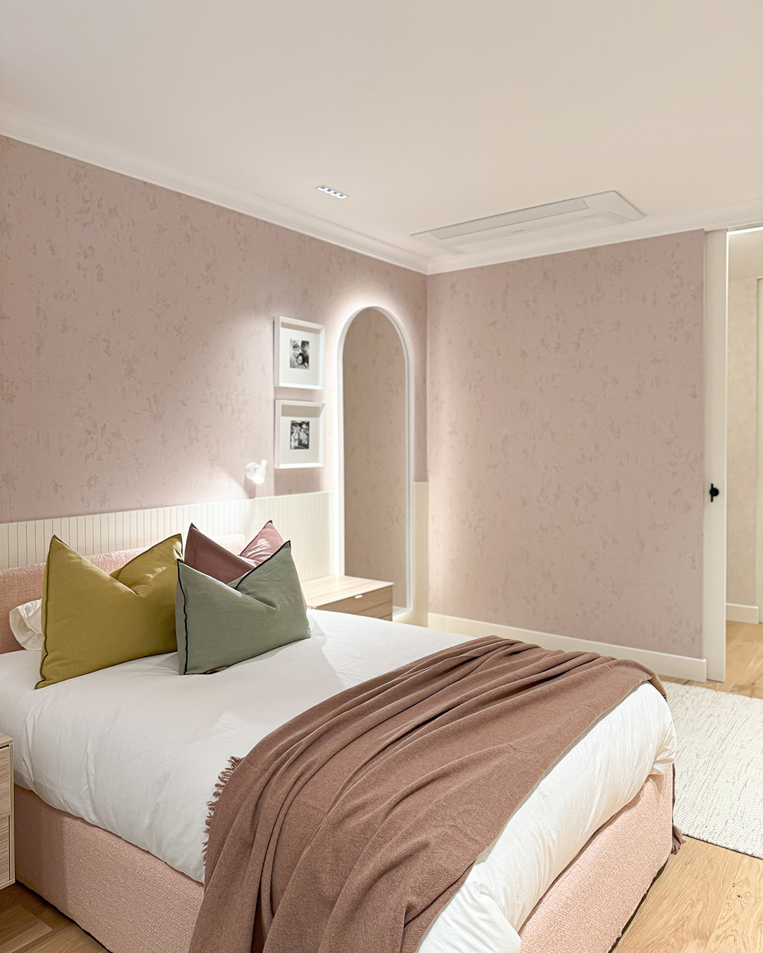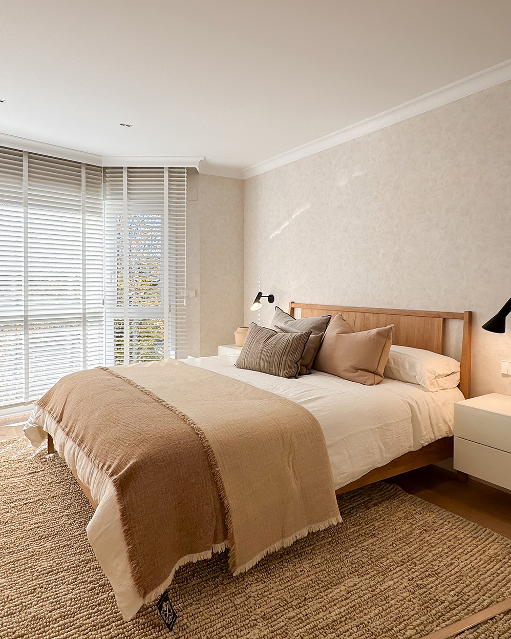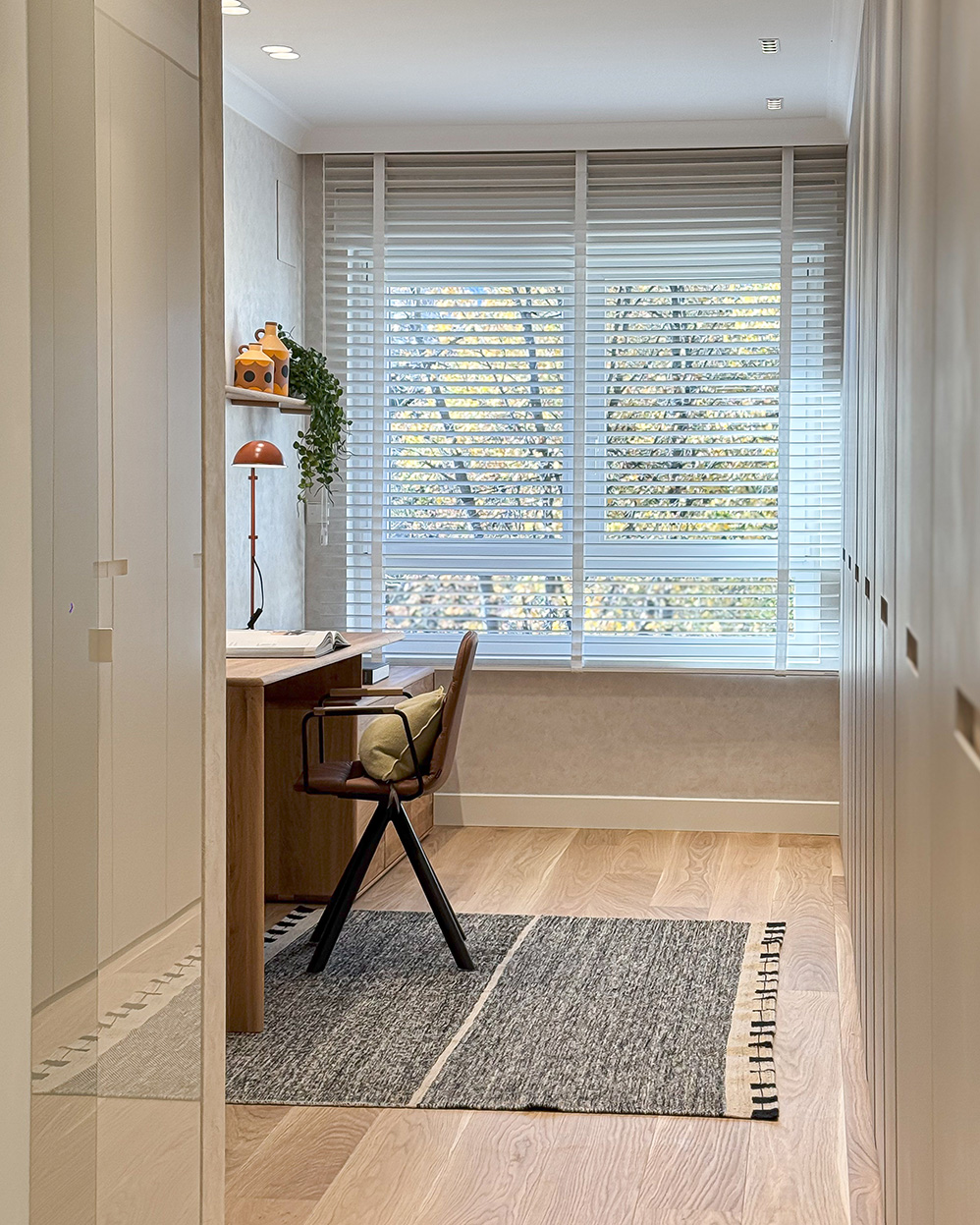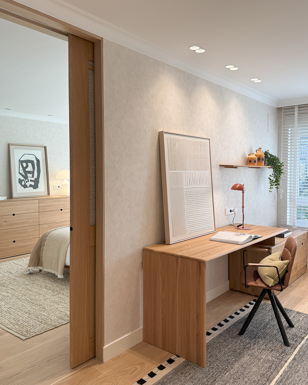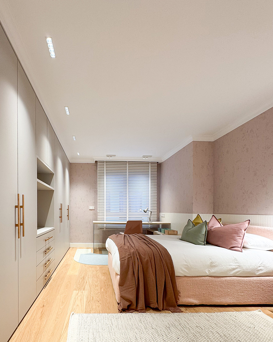 Desde este espacio central se accede a la zona privada de la vivienda. Por un lado, el dormitorio principal con baño en suite, vestidor y una zona de escritorio integrada. Las puertas y el mobiliario a medida refuerzan la continuidad visual y la sensación de calma. Por otro lado, las habitaciones de las niñas se plantean de forma simétrica, optimizando el espacio de estudio y almacenamiento para que puedan adaptarse a su crecimiento sin perder funcionalidad. Ambas comparten un baño situado fuera de los dormitorios.