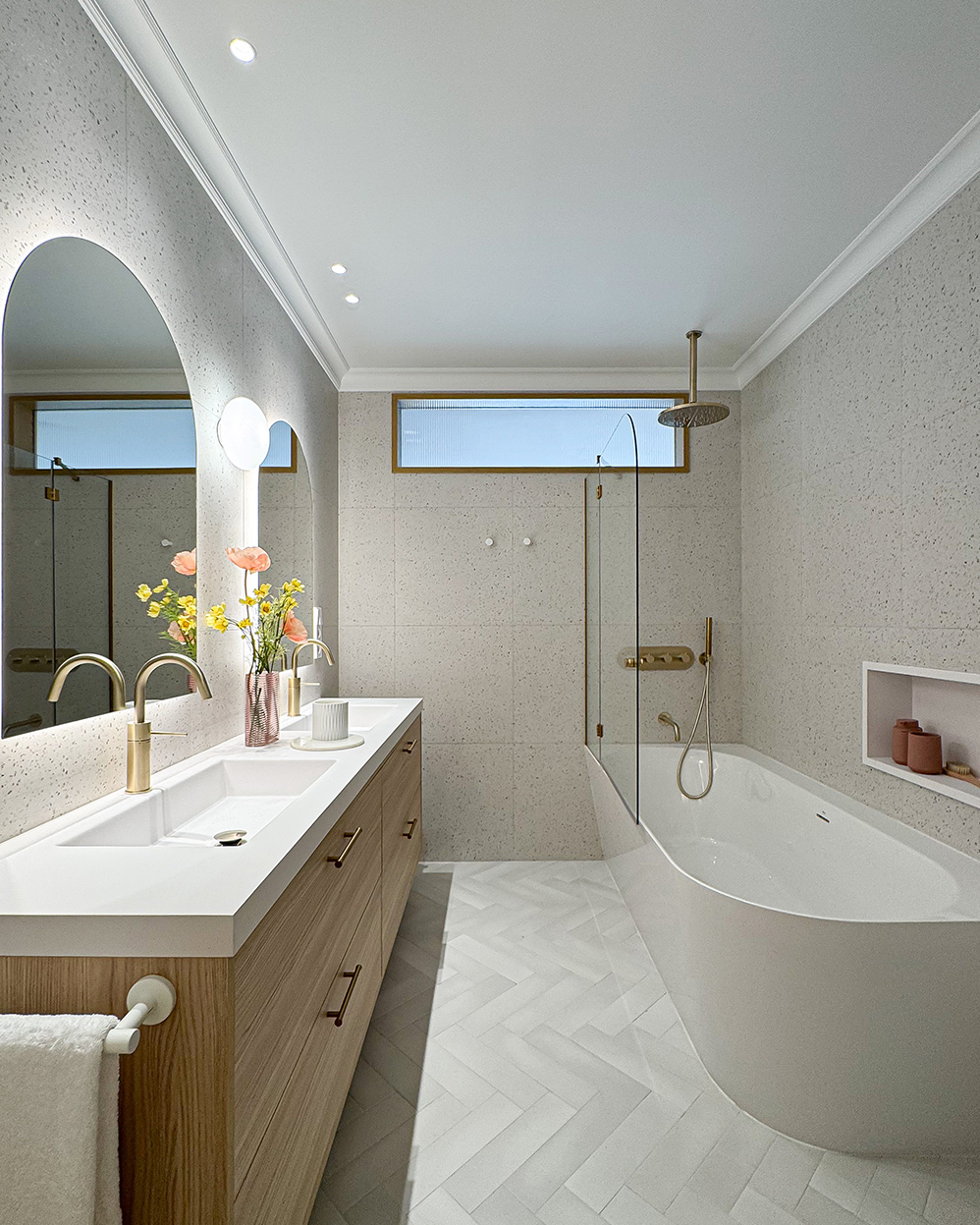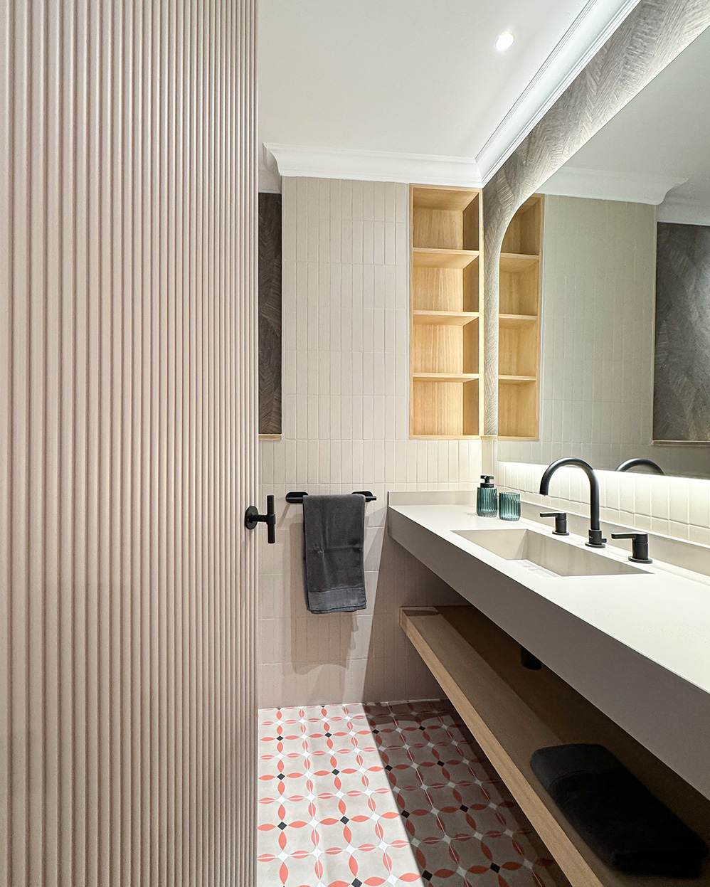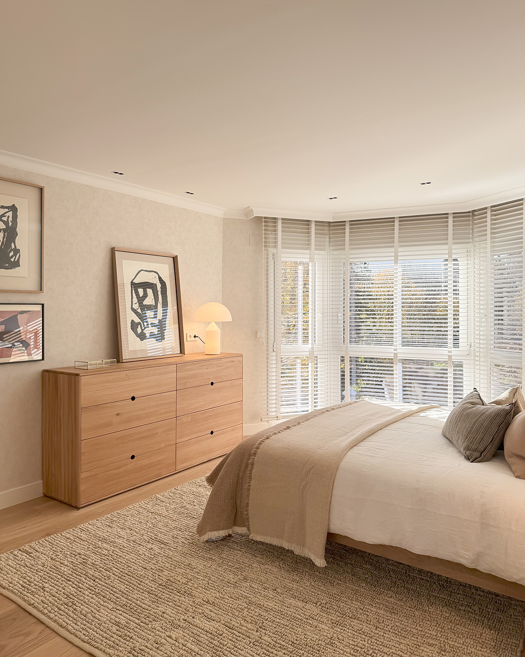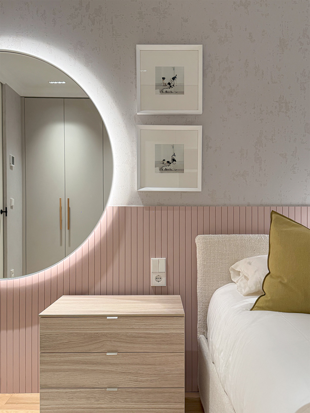 Desde este espacio central se accede a la zona privada de la vivienda. Por un lado, el dormitorio principal con baño en suite, vestidor y una zona de escritorio integrada. Las puertas y el mobiliario a medida refuerzan la continuidad visual y la sensación de calma. Por otro lado, las habitaciones de las niñas se plantean de forma simétrica, optimizando el espacio de estudio y almacenamiento para que puedan adaptarse a su crecimiento sin perder funcionalidad. Ambas comparten un baño situado fuera de los dormitorios.