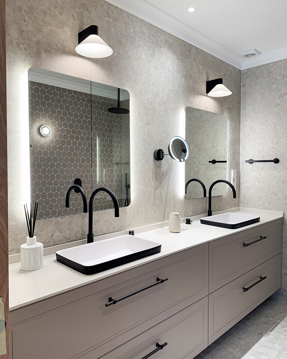 El proyecto pone especial atención en los detalles constructivos, la iluminación y los materiales. Elementos diseñados a medida, como la chimenea, los frentes de armarios o las carpinterías, conviven con una cuidada selección de luminarias de firmas como Louis Poulsen o Santa & Cole, que aportan carácter y coherencia al conjunto.