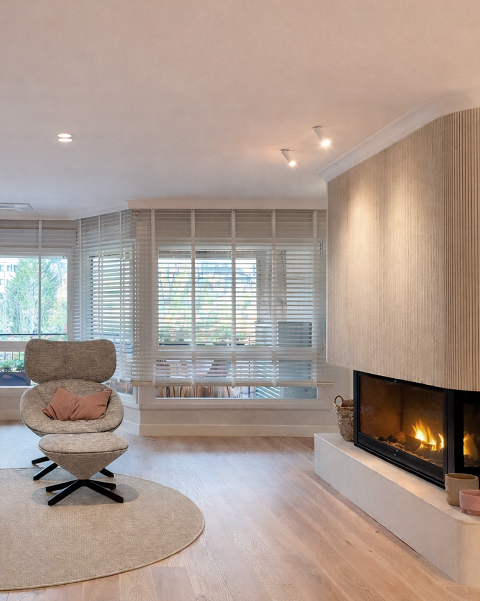 Desde el acceso principal se entra directamente al corazón de la vivienda: un gran espacio común que integra comedor, cocina con isla y salón, concebido como una única pieza continua. La isla de la cocina actúa como elemento central y vertebrador, reforzando la idea de convivencia y uso flexible del espacio. A continuación, el salón se articula en torno a una chimenea diseñada a medida, acompañada por una zona de lectura y descanso más relajada, pensada para un uso pausado y diferenciado del sofá tradicional.